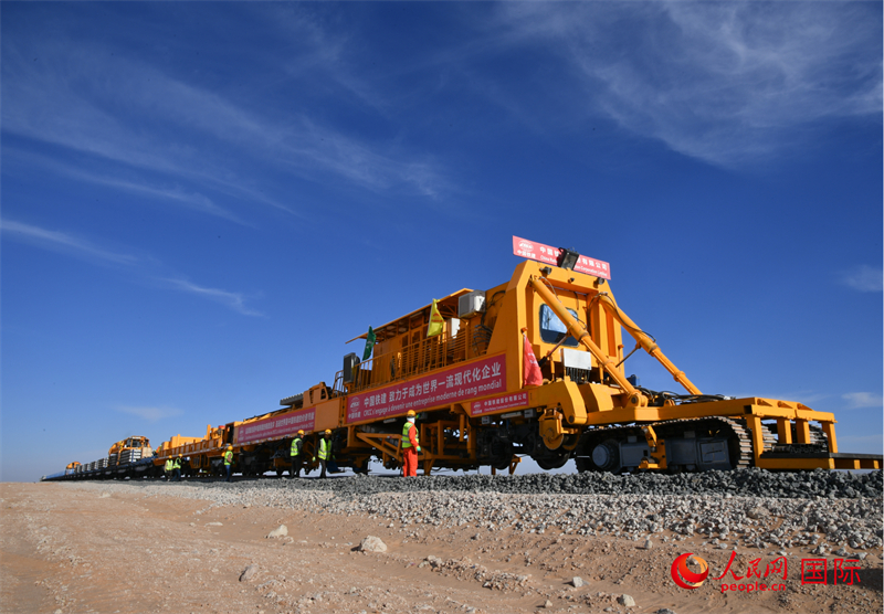 非洲首条沙漠重载铁路优先段轨道铺设现场。人民网记者 郝瑞敏摄