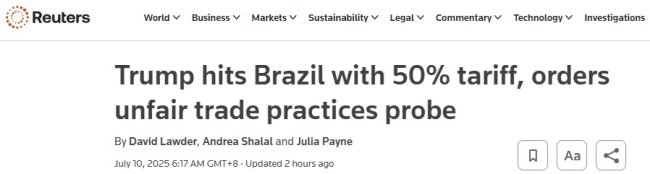 美国总统特朗普当地时间周三将贸易怒火转向巴西,威胁对巴西出口至美国的商品征收50%的惩罚性关税,并下令对巴西进行不公平贸易行为调查。此举可能导致更高的关税。特朗普在周三下午公布发给巴西总统卢拉的信函中表示,新税率为50%,远高于4月2日对巴西征收的10%关税,自8月1日起适用。