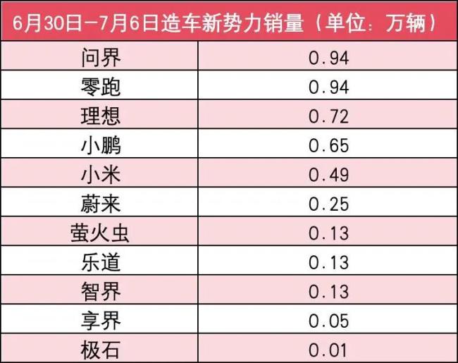 小鹏则下滑至第四位。6月30日-7月6日,小鹏销量为0.65万辆,较前一周下滑了0.47万辆,是所有新势力品牌中销量下滑最多的一家。此次销量下滑可能与上月底的销量冲刺有关。伴随着MONA M03 MAX版产能的释放,小鹏销量在6月23日-6月29日重新过万,达到了1.12万辆,创单周销量最高。在本周,小鹏的全新车型G7上市并开启交付,这款车型上市9分钟订单就破万。这款车型对于销量的贡献,将从周开始逐步释放出来。