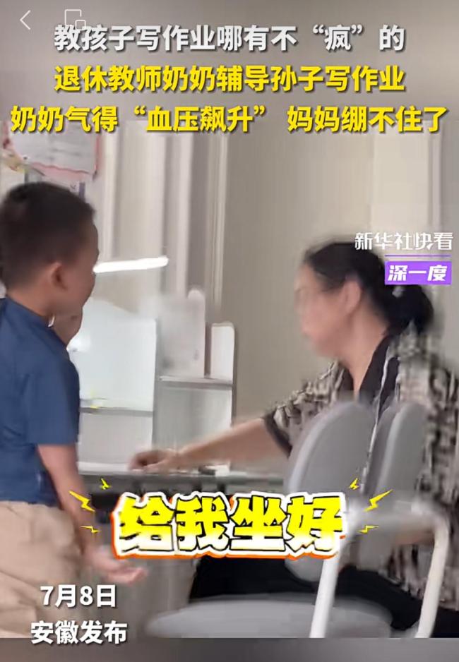 退休教师奶奶辅导孙子作业燃起来了 耐心耗尽血压飙升。辅导孩子写作业对很多家长来说都是一项挑战。孩子们天性爱玩,好不容易让他们坐下来写作业,也常常是写一会儿就分心去玩。即便是平时对孩子宠爱有加的爷爷奶奶,也会失去耐心。