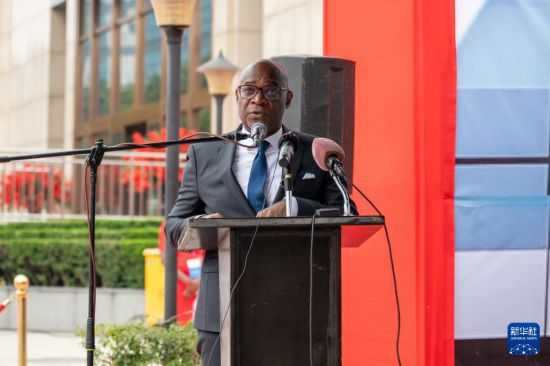 7月11日,刚果(布)财政、预算和国库部长克里斯蒂安·约卡在布拉柴维尔举行的中刚非洲银行开业十周年庆祝活动上致辞。新华社记者 郑扬子 摄