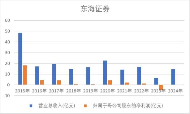 这份重罚对东海证券而言堪称雪上加霜。回顾其近年业绩:2023年归母净利润巨亏4.92亿;2024年虽扭亏为盈,但盈利仅为2348.7万。2021-2024年四年间,公司累计亏损1.06亿,这笔6000万元的罚金无疑又给了当头一棒。