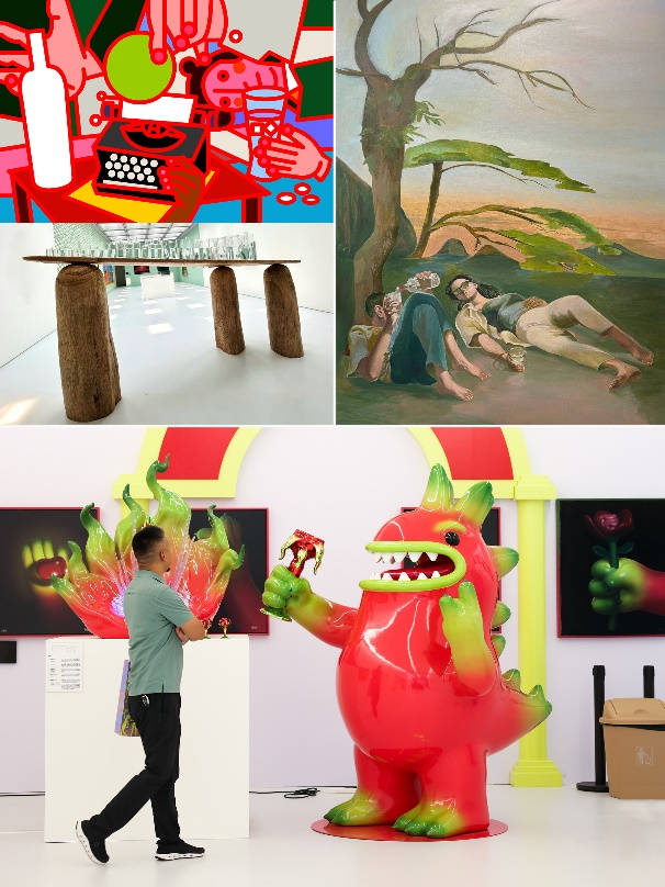 图下部:张超级,《举杯就干1573》,2025,玻璃钢烤漆、透明树脂、不锈钢电镀,火龙果酒托:117×85×116cm、火火龙雕塑:150×170×220cm、火龙果酒杯:67×67×12cm、火龙果瓶盖:10×10×12cm,致谢艺术家