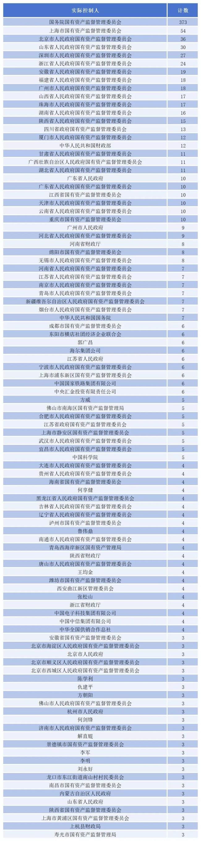 中央层面,国务院国有资产监督管理委员会是373家上市公司的实控人;财政部是12家上市公司的实控人;国务院是7家上市公司的实控人。