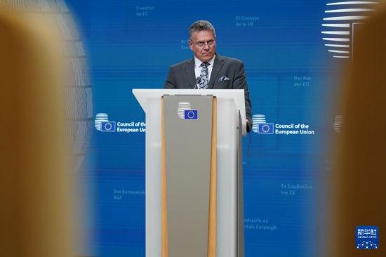7月14日,在比利时布鲁塞尔,欧盟委员会负责贸易和经济安全等事务的委员谢夫乔维奇出席新闻发布会。新华社记者 彭子洋 摄