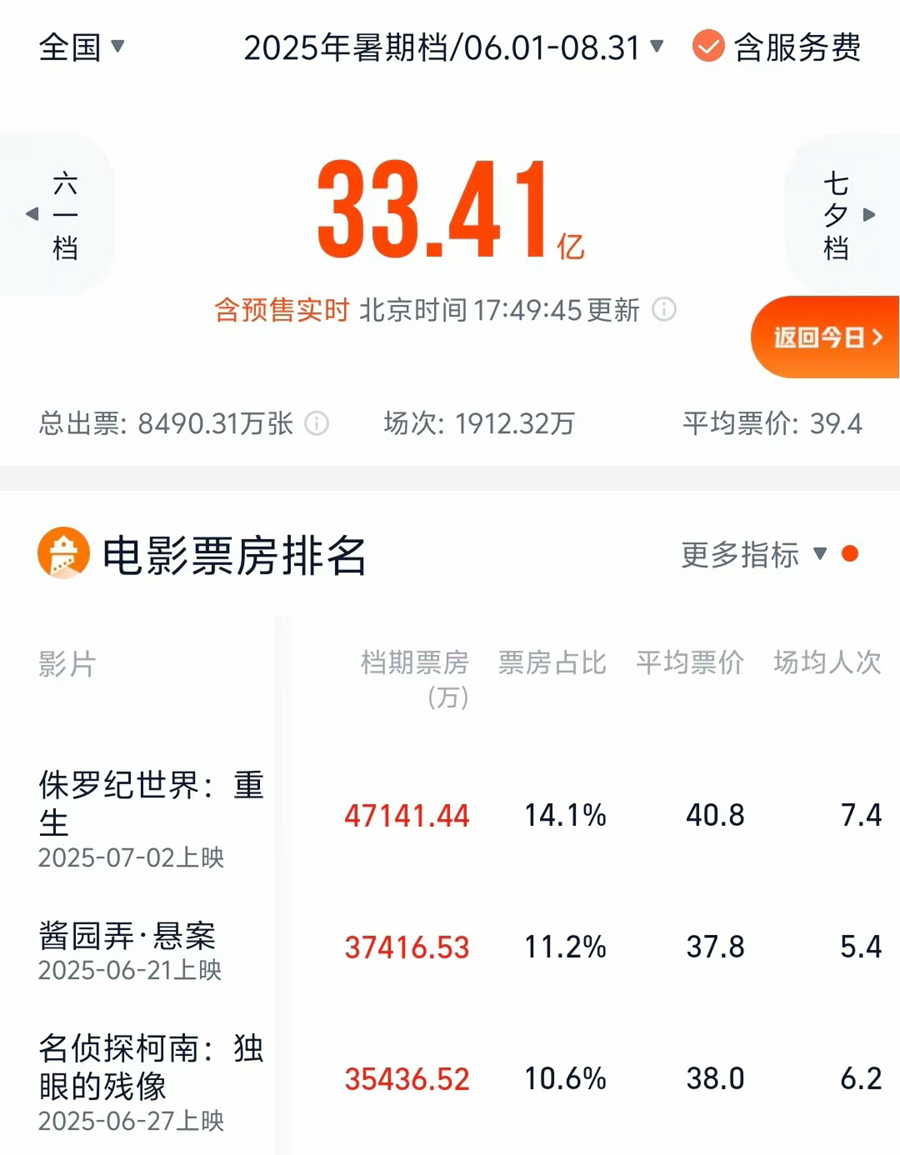 截至7月15日17时,2025暑期档票房达33.41亿。来源:票务平台截图