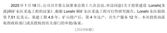 公司拟投资7.5亿美元建设Lonshi东区采选工程,预计基建工期4.5年,矿山投产后,第4年达产,达产后龙溪铜矿东西区合计年产约10万吨铜金属。