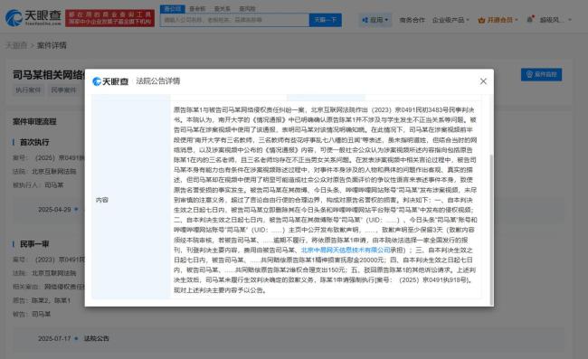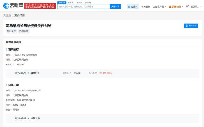天眼查App显示,7月17日,因司马南未履行致歉义务,陈某某申请强制执行,北京互联网法院公告该案件判决书。案件流程信息显示,今年4月,司马南已因该案被执行2万余元。