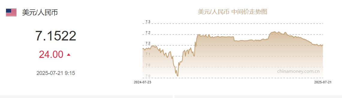 中新网7月21日电 据中国外汇交易中心网站消息,中国人民银行授权中国外汇交易中心公布,2025年7月21日银行间外汇市场人民币汇率中间价为:1美元对人民币7.1522元,下调24个基点。