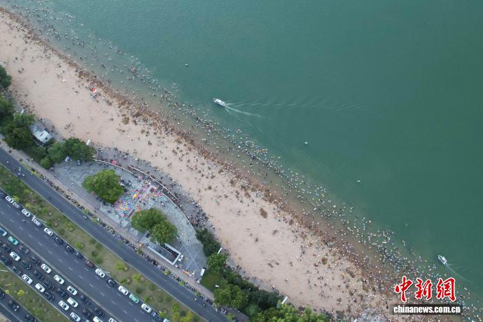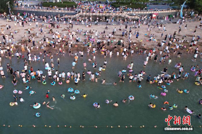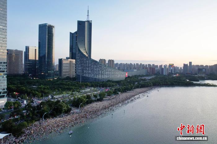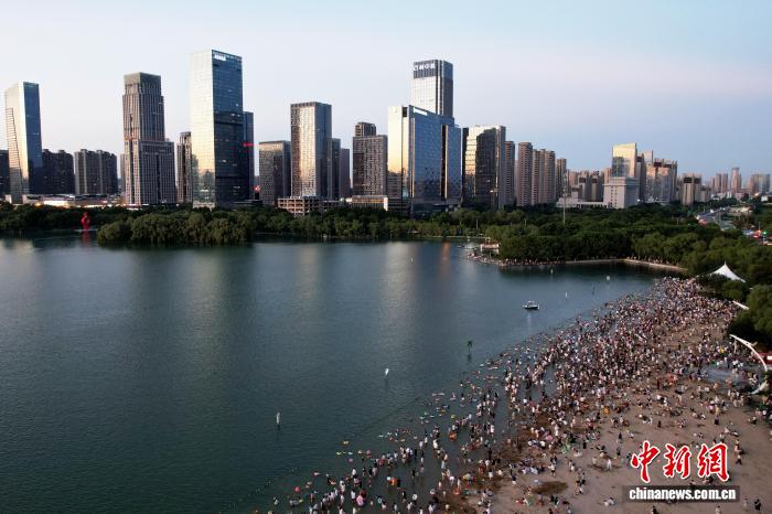 7月20日,安徽合肥市民在天鹅湖畔嬉水。(无人机照片)连日来,合肥持续高温。每到傍晚,天鹅湖沙滩、安全水域成为当地市民纳凉避暑的首选。张强 摄
