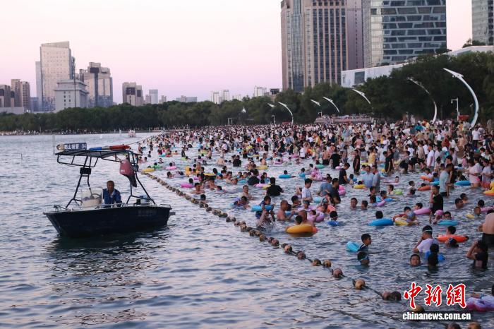 7月20日,安徽合肥市民在天鹅湖畔嬉水。连日来,合肥持续高温。每到傍晚,天鹅湖沙滩、安全水域成为当地市民纳凉避暑的首选。张强 摄