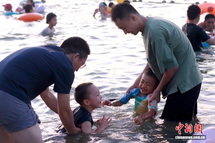 7月20日,安徽合肥市民在天鹅湖畔嬉水消暑。连日来,合肥持续高温。每到傍晚,天鹅湖沙滩、安全水域成为当地市民纳凉避暑的首选。张强 摄