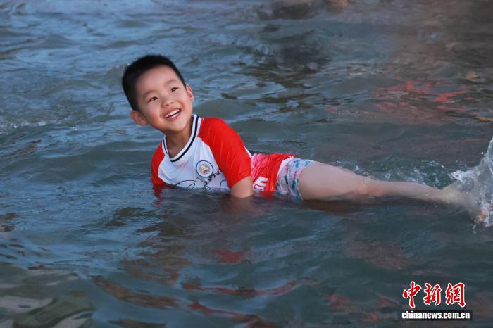 7月20日,一位小朋友在安徽合肥天鹅湖畔嬉水。连日来,合肥持续高温。每到傍晚,天鹅湖沙滩、安全水域成为当地市民纳凉避暑的首选。张强 摄