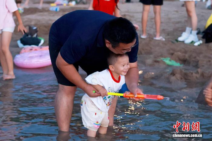7月20日,一对父子在安徽合肥天鹅湖畔嬉水。连日来,合肥持续高温。每到傍晚,天鹅湖沙滩、安全水域成为当地市民纳凉避暑的首选。张强 摄