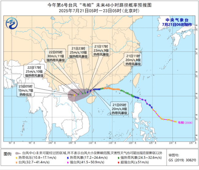 大风预报显示,7月21日08时至22日08时,受“韦帕”和西南季风共同影响,东海大部及钓鱼岛附近海域、巴士海峡、台湾海峡南部、南海大部、琼州海峡、东沙群岛、西沙群岛、中沙群岛、南沙群岛以及海南岛沿海、浙江沿海、广东中西部沿海、广西沿海等地将有6~7级风,阵风8~9级。北部湾、琼州海峡、广东西部沿海、广西沿海、海南岛沿海的风力可达8~9级,阵风10~11级,北部湾部分海域风力有10~11级,阵风12~13级。