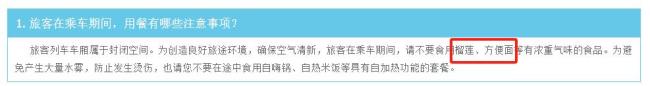 12306回应称,建议乘客在列车上尽量选择味道较小的食物,以免影响其他乘客。中国铁路12306官网的出行指南中也指出,由于旅客列车车厢属于封闭空间,为确保旅途环境良好和空气清新,乘车期间请勿食用榴莲、方便面等气味浓重的食品。全国铁路客户服务热线工作人员表示,不含加热包的普通方便面可正常携带上车,但最好还是食用味道较小的食物。至于榴莲,则明确不能在公众场合食用。