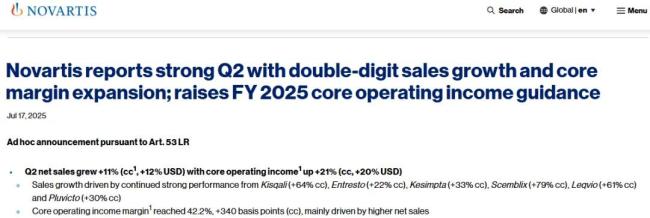 7月17日,诺华发布2025年半年报:创造净销售额为272.87亿美元,按固定汇率计算同比增长13%(下同);实现净利润为76.33亿美元,同比增长31%。其中,诺华中国区销售额为22亿美元,同比增长8%。