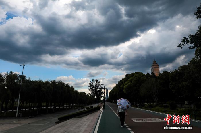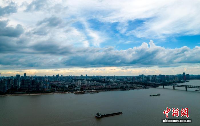 图为汉口江滩上空蓝天与乌云同现,宛如大自然绘就的“阴晴交界图”。中新社记者 张畅 摄