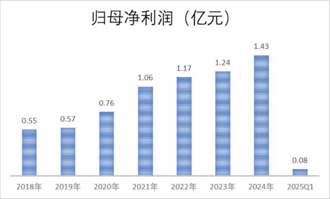 利润方面,则从2018年的0.55亿稳步上升至2024年的1.43亿,复合增长率达到17.26%,2025年一季度继续同比高增21.19%至0.08亿。