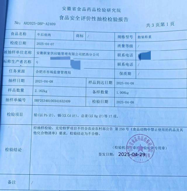 合肥市市场监管局今年4月对两家公司的牛肉进行了检查,结果检测出了国家明令禁止的“克伦特罗”,即俗称的“瘦肉精”。其中一家被检查抽样单位是肥西学前教育发展集团有限公司,该公司被检测的是牛里脊肉,样品中“克伦特罗”的数量值为10.2μg/kg。另一家被检查抽样单位是安徽联家供应链管理有限公司肥西分公司,样品为牛后座肉,“克伦特罗”的数量值为1.42μg/kg,两份样本均不合格。