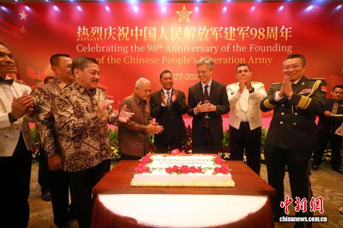 中新网雅加达7月24日电 (记者 李志全)7月22日晚,中国驻印度尼西亚使馆在雅加达举行招待会,热烈庆祝中国人民解放军建军98周年,中国驻印尼大使王鲁彤等使馆以及中国驻东盟使团外交官出席。印尼前国防部长普尔诺莫、国防部监察长路易中将、国防大学校长安顿、前海军参谋长马塞提奥退役海军上将等印尼军政官员,各国驻印尼使节、武官,印尼工商界代表,驻印尼中资机构代表,华侨华人代表等850余人参加。