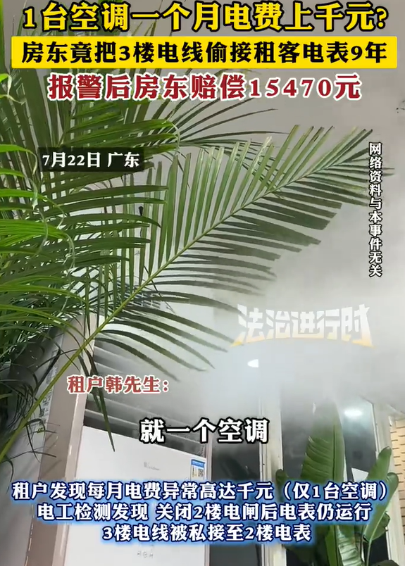 7月22日,广东。一租户发现每月电费异常高达千元(仅1台空调),电工检测发现关闭2楼电闸后电表仍运行,3楼电线被私接至2楼电表。租户自5月起电费激增(与3楼入住时间吻合),9年累计多缴电费15470元。结果:房东拔除私接电线并全额退款,租户已搬离。