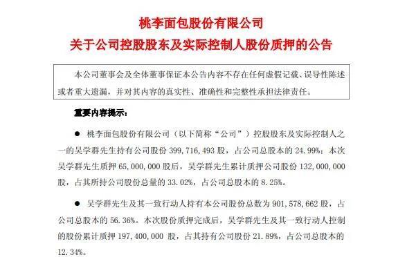 此外,7月26日,桃李面包发布关于公司控股股东及实际控制人股份质押的公告称,公司控股股东及实际控制人之一的吴学群持有公司股份4亿股,占公司总股本的24.99%;本次吴学群质押6500万股后,吴学群累计质押公司股份1.32亿股,占其所持公司股份总量的33.02%,占公司总股本的8.25%。