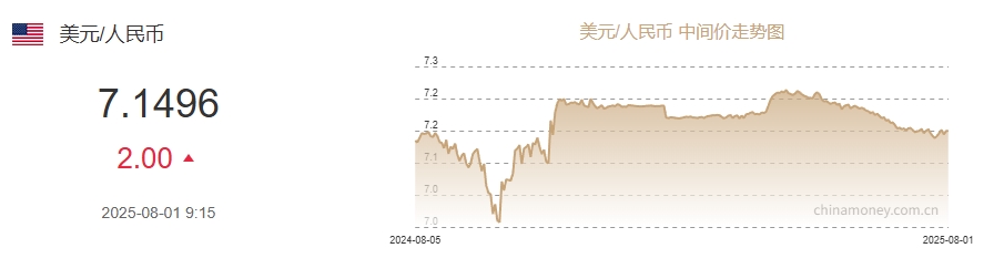8月1日人民币对美元中间价报7.1496元 下调2个基点