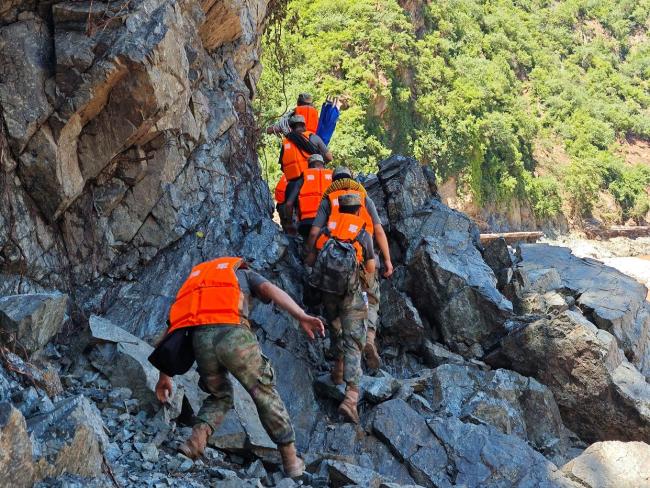除了送物资,最要紧的还是把受困群众转移到安全地带。在悬崖峭壁处,官兵们侧身紧贴湿滑的山石,一手抓住牵引绳,一只手牢牢攥住群众的胳膊。年轻的小战士蹲下身来背起老人,老人看着这个比自己孙子还小的战士迟疑着,“你能背动我吗?”小战士爽快回答:“没问题的!”