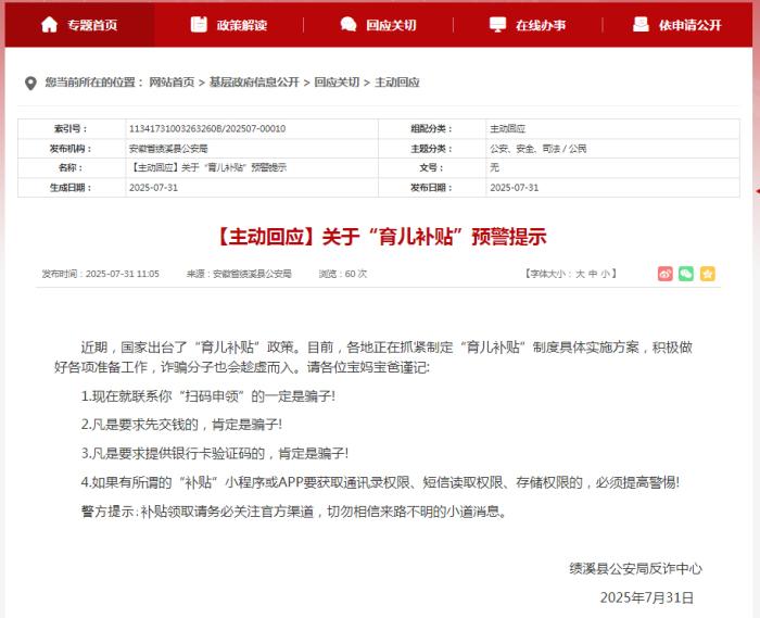安徽绩溪县公安局7月31日发布关于育儿补贴的预警提示。