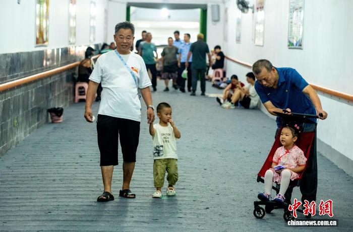 8月5日,在武昌蛇山人防工程纳凉点,老人带着小孩来此纳凉。中新社记者 张畅 摄