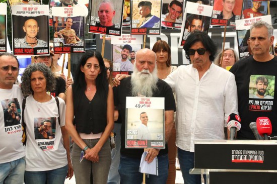 4月18日,在以色列特拉维夫的一处广场,被扣押人员家属举行记者会,要求以政府推动释放被扣押人员。新华社发(吉德翁·马科维奇摄/基尼图片社)