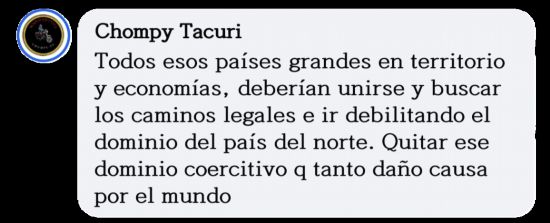厄瓜多尔网友乔姆皮·塔库里说:“我们应该联合起来,寻求合法的途径,逐步削弱美国的支配地位,终结给世界带来巨大伤害的美国霸权。”