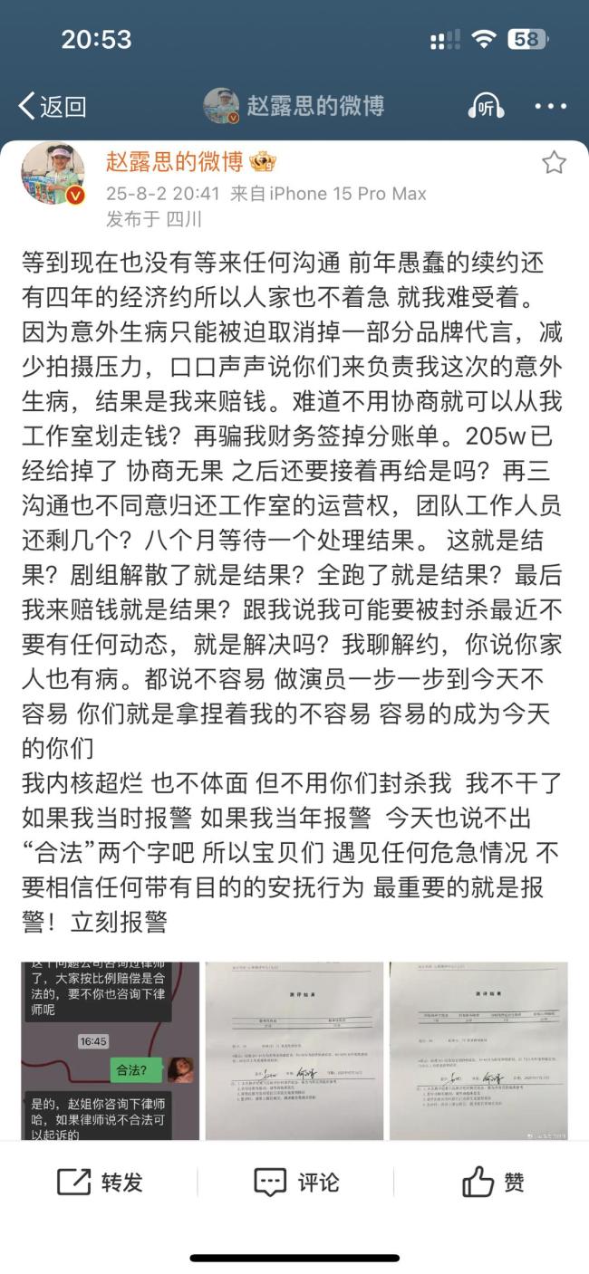 8月2日晚,赵露思在公开喊话经纪公司未得到回应后,发长文控诉银河酷娱。文中提到,在赵露思治疗期间,公司曾承诺为她被迫取消的代言负责,但最后却直接从她工作室的账户中划走了205万元,以及工作室运营权归属、解约协商无果等问题。她在博文中写道:“我内核超烂,也不体面,但不用你们封杀我,我不干了。如果我当时报警,今天也说不出‘合法’两个字吧,所以宝贝们,遇见任何危急情况不要相信任何带有目的的安抚行为,最重要的就是报警!立刻报警。”