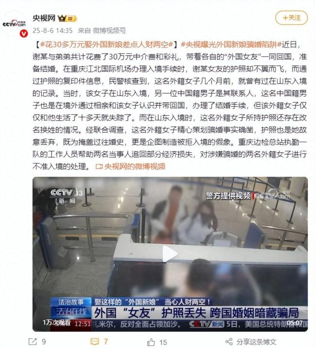 近日,谢某与弟弟共花费了30万元中介费和彩礼,带着各自的“外国女友”回国准备结婚。在重庆江北国际机场办理入境手续时,谢某女友的护照不见了。通过护照复印件信息,民警发现这名外籍女子几个月前曾在山东入境。