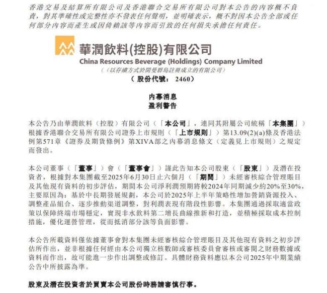 近日,怡宝母公司华润饮料发布业绩预警公告,预计今年上半年公司净利润同比减少20%至30%。