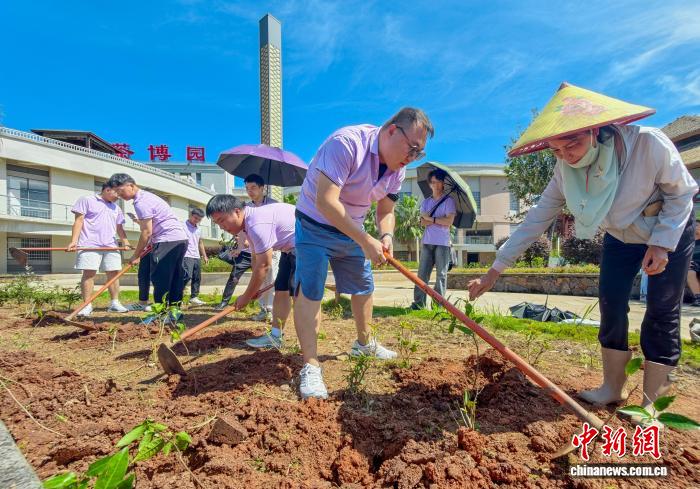 在白沙茶博园,港澳大学生们了解茶叶加工流程,品鉴现场冲泡的白沙绿茶与红茶。在茶博园前的空地上,工作人员指导港澳大学生们挥锹培土,亲手栽下一株株茶树苗。
