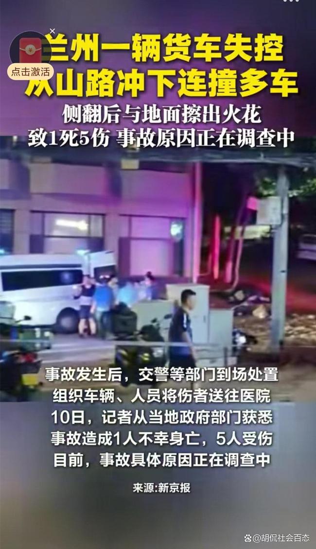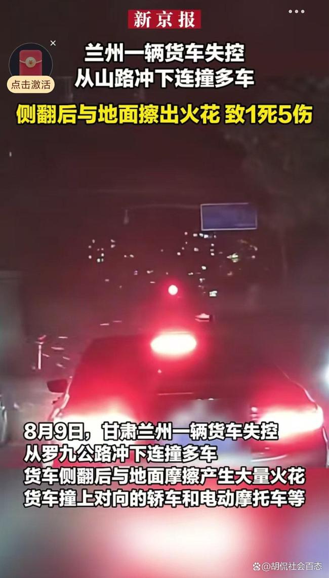 兰州货车失控连撞多车 事故致1死5伤引发热议。8月9日,兰州罗九公路上发生了一场意外。一辆货车在行驶中突然失控,冲下山路,接连撞上多辆车辆,包括对向驶来的轿车和电动摩托车。撞击后,货车侧翻,车身与地面摩擦产生大量火花。事故发生后,交警等相关部门迅速到场,组织力量将伤者送往医院救治,现场处置工作有序展开。