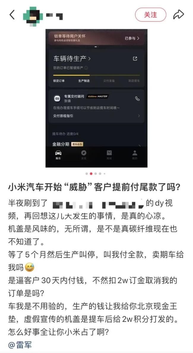 实际上不仅仅在小米SU7Ultra版,在去年年底,就有多位网友发帖吐槽小米汽车强制要求提前付尾款一事,有些车辆甚至尚未进入生产序列,用户就被要求尾款到位。“你都不能保证(4周内交付),让我现在交钱,小米就是这么办事的吗?”一位准车主面对销售顾问先付尾款的要求提出质疑。