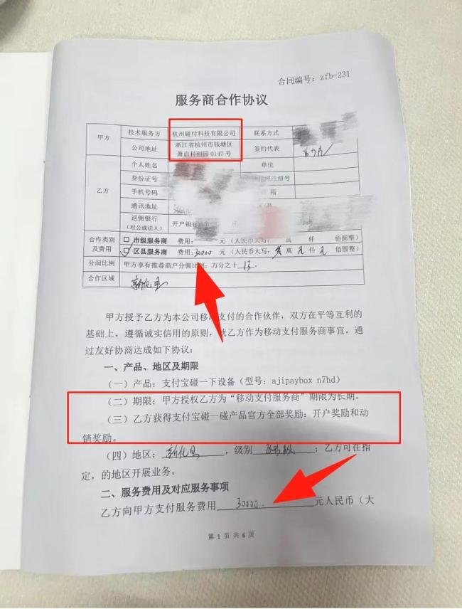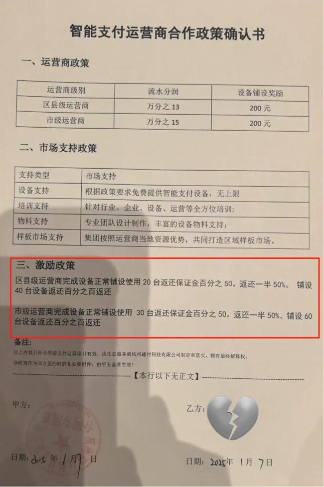 裕裕告诉记者:“在会议现场,工作人员不断强调这是支付宝官方项目,宣称投资3万元可获得30台刷卡机,通过商户刷卡流水赚取分润,简单说就是只要参与合作代理就能挣很多钱,而且对方承诺几天内可退款。在对方的再三劝说下我签了一份交易合同。”