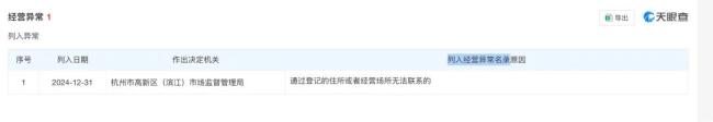 工商信息显示,该公司地址进行过多次变更。2024年12月,杭州市高新区(滨江)市场监督管理局,因通过登记的住所或者经营场所无法联系,将该公司列入经营异常名录。