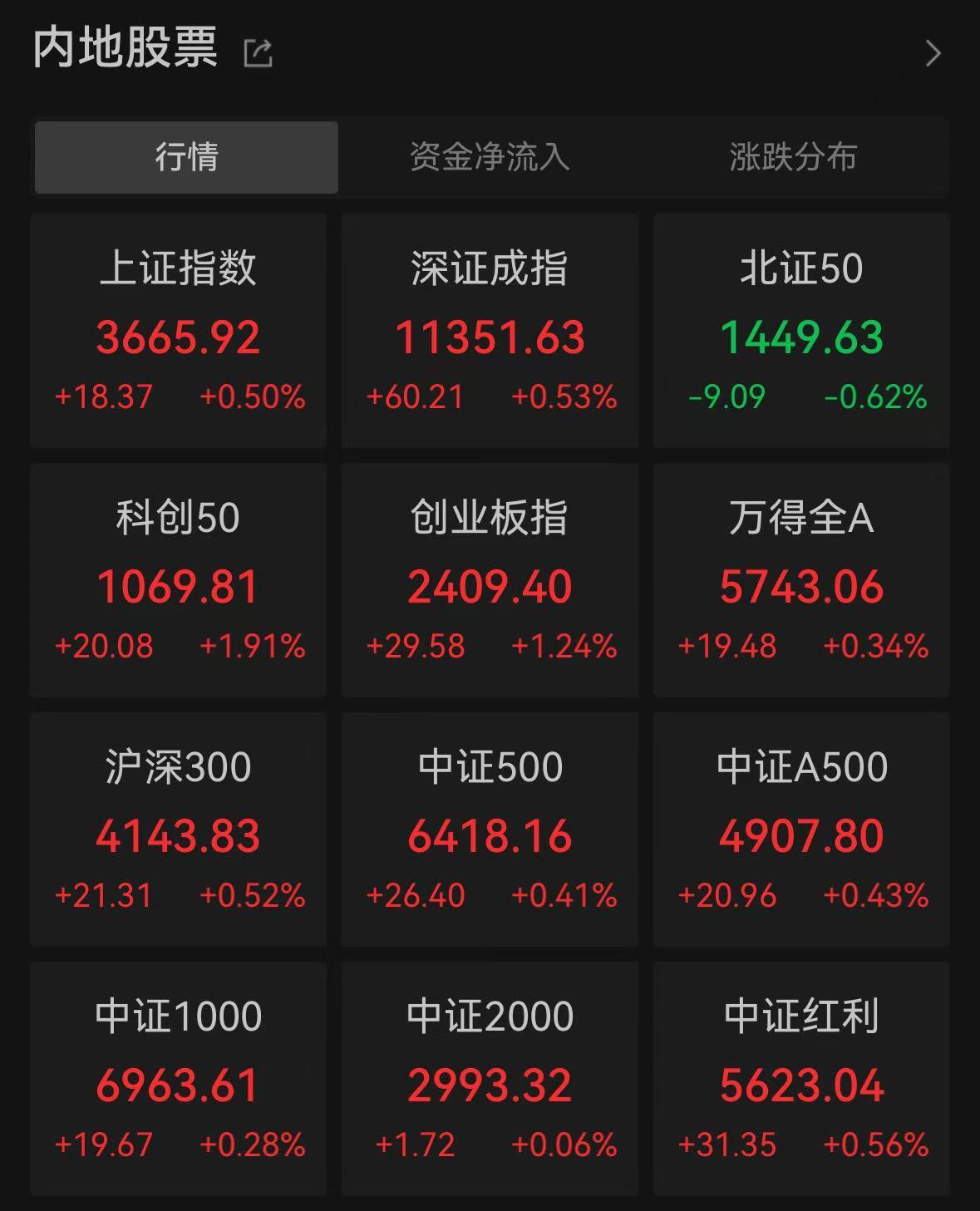 截至收盘,沪指涨0.5%,深成指涨0.53%,创业板指涨1.24%。