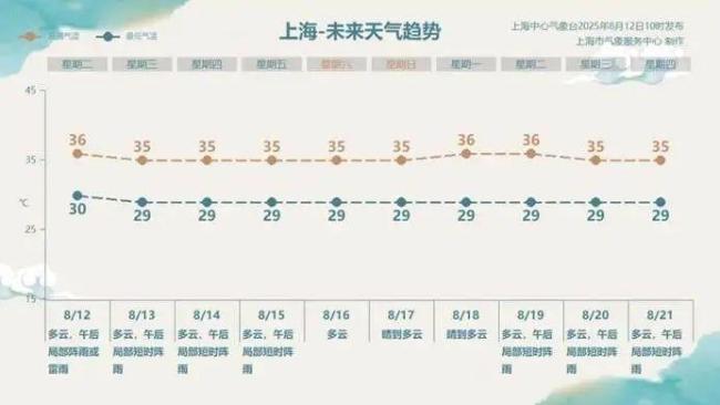 今年三伏天的高温终于到来。在副热带高压的影响下,未来十天上海将持续高温,预计最高气温维持在35℃-36℃,最低气温也有28℃-29℃。尽管有时午后会出现热对流天气,但这些短暂的热雷雨无法缓解暑热。截至目前,上海今夏已有26个高温日。