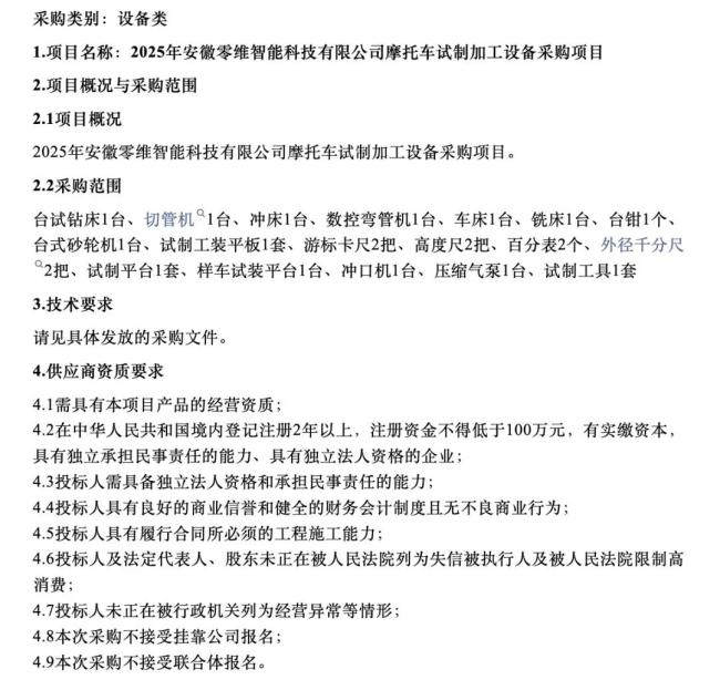 正在冲击IPO的奇瑞,对自己的商业版图又在酝酿一次新的扩充。8月13日,飞灵汽车发现,一家名为安徽零维智能科技有限公司正在招标摩托车试制加工设备采购项目,而经过查询,这家公司与奇瑞有着很深的关系。因为该公司的董事长为鲍思宇,其目前为奇瑞控股集团执行副总经理、奇瑞商用车总经理。而该公司的另外投资人则为淮北市政府。