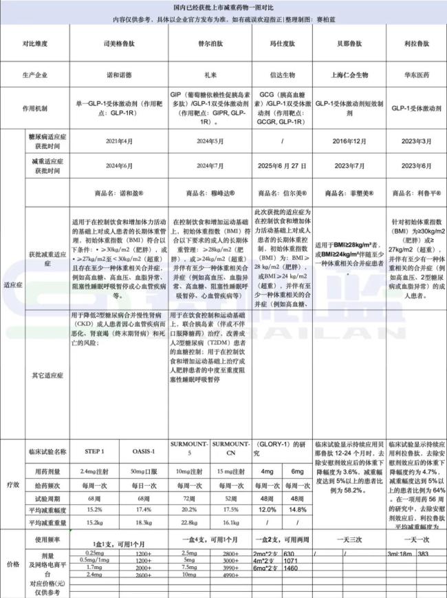截至目前,国内市场上市的减肥针已有:诺和诺德的司美格鲁肽、礼来的替尔泊肽、华东医药的利拉鲁肽、仁会生物的贝那鲁肽和信达的玛仕度肽。