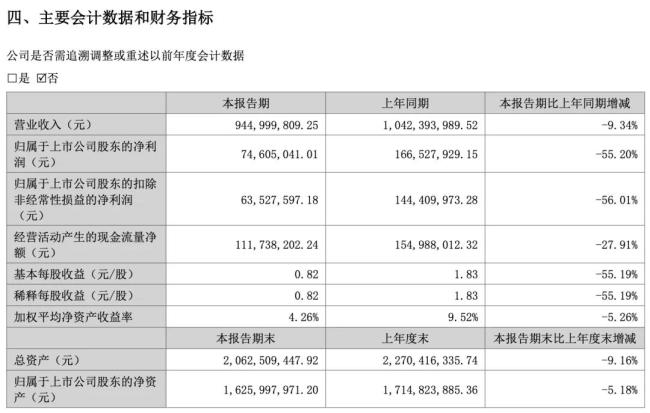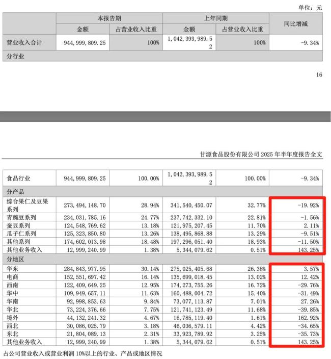 根据甘源食品股份有限公司(下称“甘源食品”)最新披露的2025年半年度报告显示,公司实现营收9.45亿元,同比下降9.3%;实现归母净利润7460.5万元,同比下降55.2%;实现扣非归母净利润6352.76万元,同比下降56.0%。
