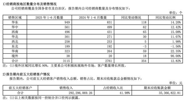 报告期内,甘源食品的经销商数量同比增长了12.82%至3115家,不过,经销商的数量增长并未带动甘源食品的营收增长。值得一提的是,甘源食品来自前五大经销商的收入高达2.92亿元,占经销收入的41.98%,且这五大经销商的营收账款高达3536.68万元,占到甘源食品营收账款总额的45.9%,足以证明甘源食品与这五大经销商的相互重视程度。
