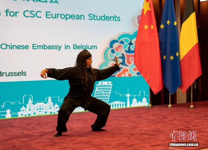 即将赴华的留学生代表在欢送会上表演武术。中国驻比利时使馆 供图
