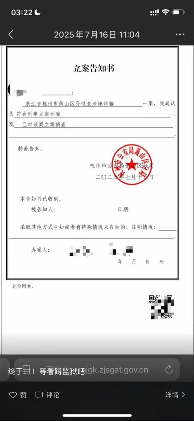 陈龙用了很多天接受这个事实。7月16日,他晒出杭州市公安局萧山区分局出具的立案告知书:杭州市萧山区孙悦童涉嫌诈骗一案,我局认为符合刑事立案标准,现已对该案立案侦查。