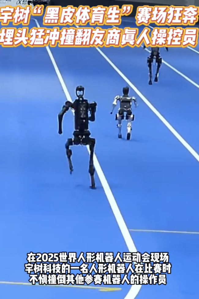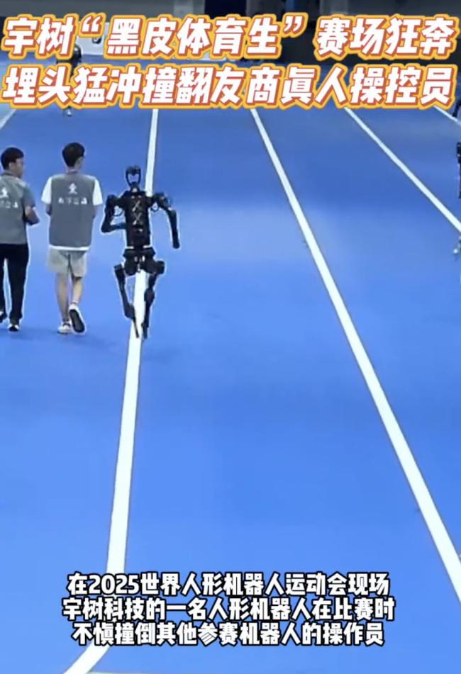 宇树机器人埋头猛冲撞翻友商操控员。宇树“黑皮体育生”赛场狂奔,埋头猛冲撞翻友商真人操控员。在2025世界人形机器人运动会现场,宇树科技一人形机器人在比赛时,不慎撞倒其他参赛机器人的操作者。撞完人后,该机器人继续狂奔比赛,引得全场哄堂大笑。